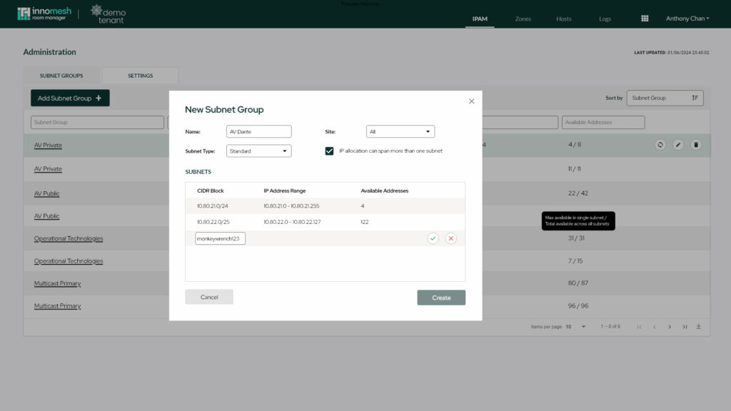 “Subnet groups” are a collection of subnets to query for auto-assignment of IP addresses. These subnets are connected to subnets in the integrated IPAM system. Once added in this menu, they will be available when configuring devices and assigning them DNS entries.