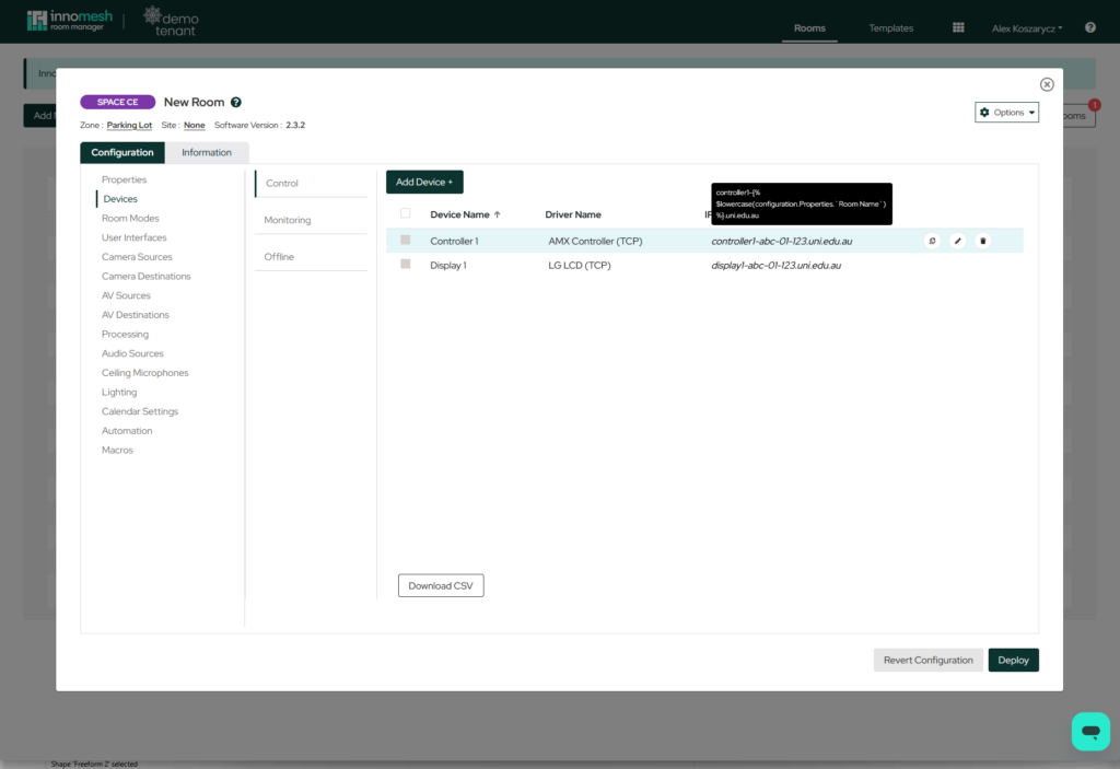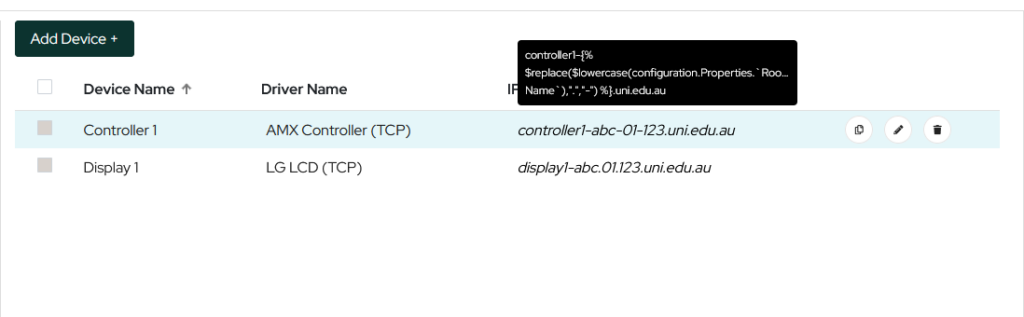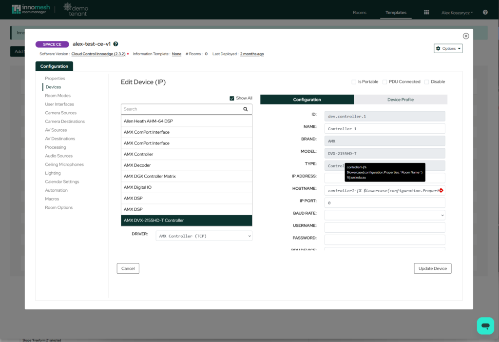 Dynamic hostname expressions can be included in room templates. When a new room is created from a template, every device hostname defined with an expression is automatically resolved using the new room’s name and configuration.